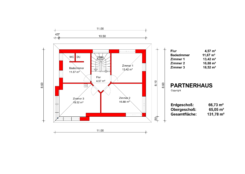 Kniestock 250 cm = Vollgeschoß, 16° Walmdach, 30 cm Dachdämmung