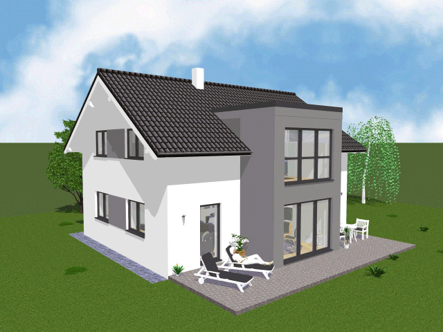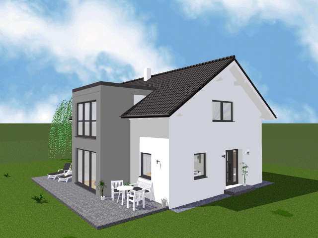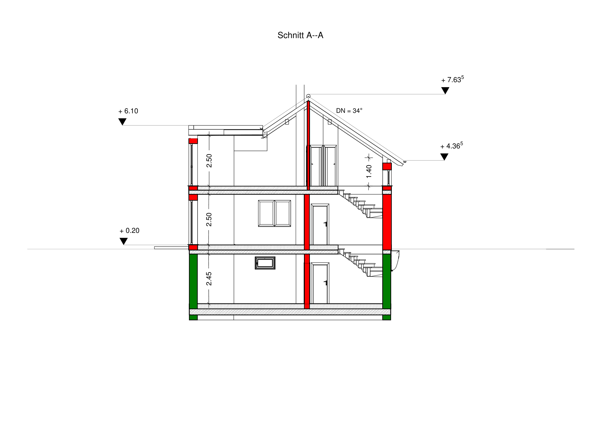 Kniestock 140 cm bzw. Vollgeschoss, 34° Satteldach, 30 cm Dachdämmung