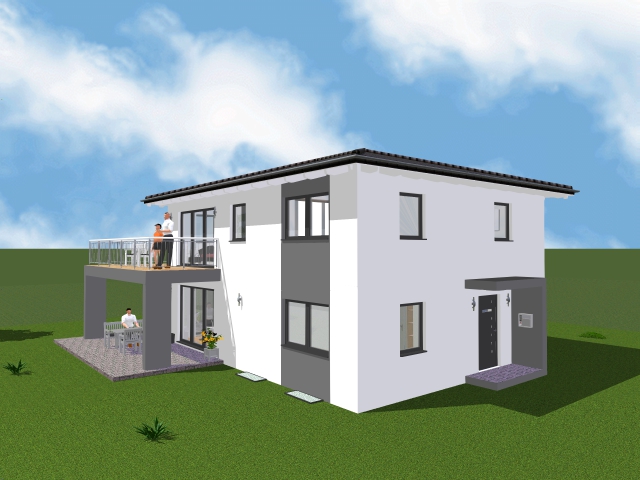 Haus laut Plan mit Walmdach und Terrassenüberdachung/Balkon